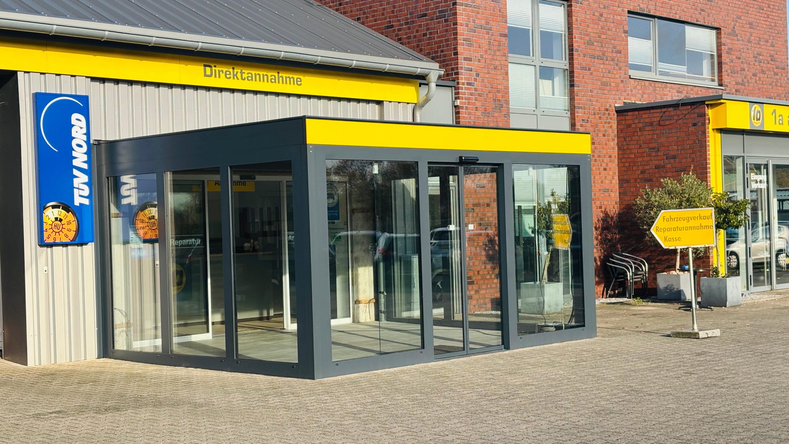 Hier errichteten wir einen Windfang aus Aluminium Fensterelementen, einer Flachdachkonstruktion und einer Automatikschiebetür, damit der Kundeneingang vor Wind und Schlagregengeschützt ist.